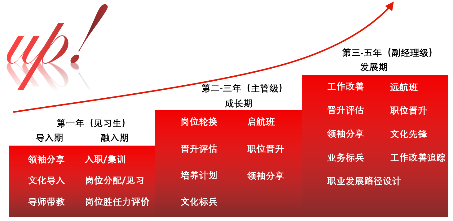 多梯次培养:亮剑班、蓄能班、扬帆班、启航班、远航班、领航班、领袖训练营;
