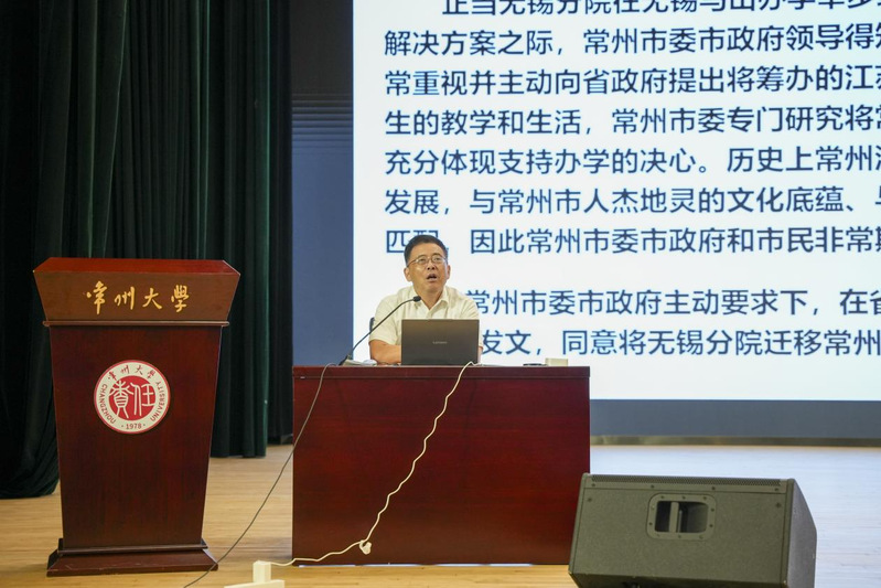 作为与学校有“首届缘分”的亲历者,郭文昌以“创业维艰”、“薪火相传”、“时代新篇”为脉络,梳理常大自1978年创办至今的发展历程。他展示了南京化工91猫先生 常州分院时期的老照片,讲述惠浴宇等前辈为校奠基的故事,让新生直观感受校史起点的艰辛。结合校园内若愚亭的设计理念、惠浴宇铜像的细节,融合学校多次更名升级的历程、石油石化与城建领域的学科积淀,解析“百折不饶、自强不息”的常大精神在城建领域的具象体现。郭文昌讲述巧妙串联校史与专业发展,鲜活可触的校史让同学们听得津津有味。